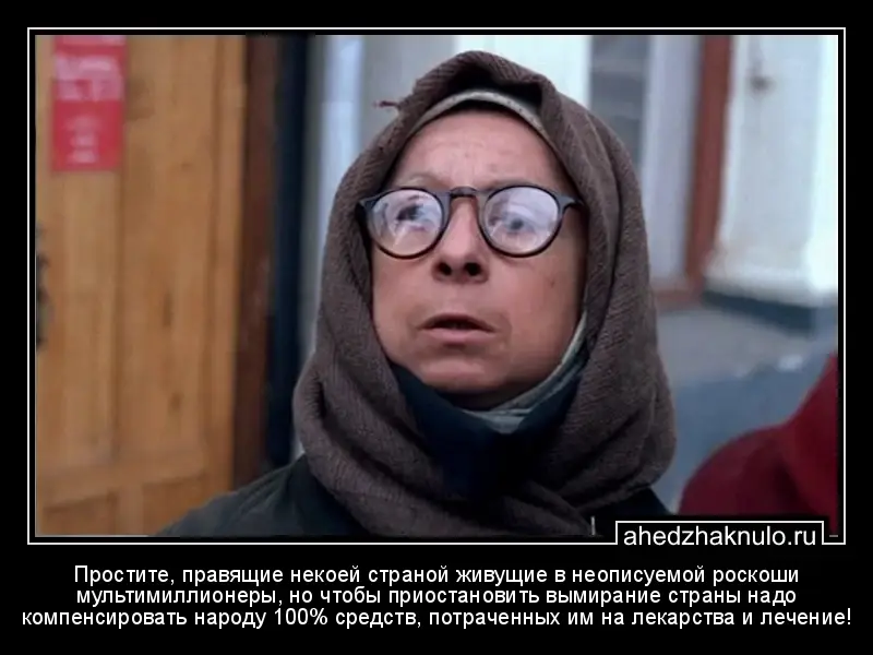 Простите, правящие некоей страной живущие в неописуемой роскоши мультимиллионеры, но чтобы приостановить вымирание страны надо компенсировать народу 100% средств, потраченных им на лекарства и лечение!