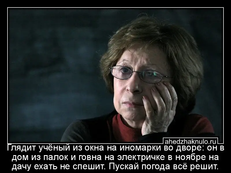 Глядит учёный из окна на иномарки во дворе: он в дом из палок и говна на электричке в ноябре на дачу ехать не спешит. Пускай погода всё решит.